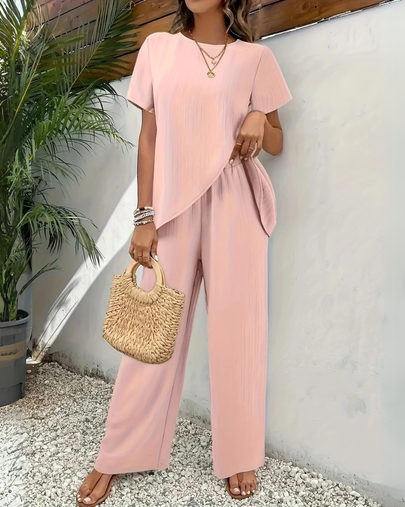 Dieses Damen-Zweiteiler-Set besteht aus einem kurzärmeligen Oberteil mit elegantem asymmetrischem Lagen-Design und einer hochgeschnittenen weiten Hose mit elastischem Bund. Der lockere Schnitt sorgt für maximalen Komfort und Bewegungsfreiheit. Perfekt für Urlaub, Freizeit oder den modernen Alltag – dieses Set vereint Schlichtheit mit einem stilvollen, modernen Look.