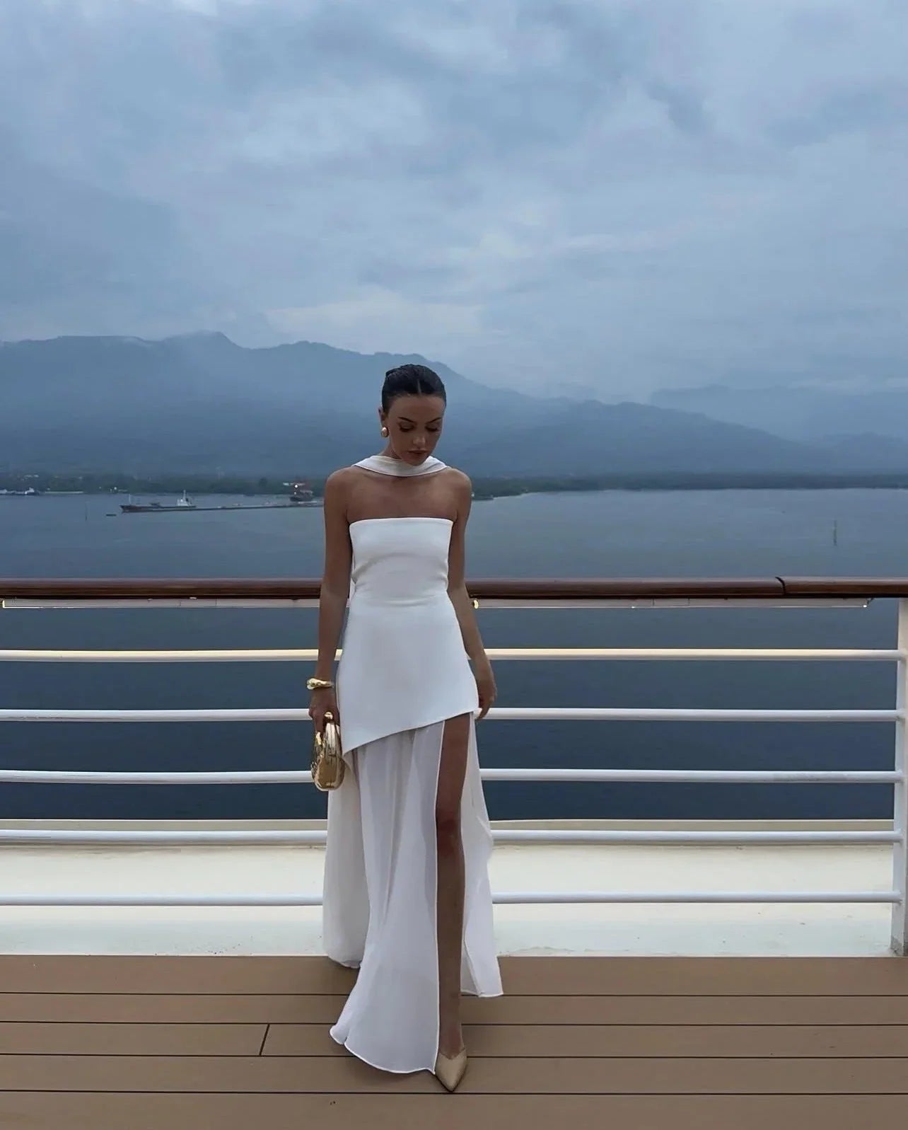 Verleihen Sie Ihrer Garderobe einen Hauch von Eleganz mit diesem stilvollen Damen Maxikleid, das perfekt für besondere Anlässe oder entspannte Strandtage gestaltet ist. Dieses Kleid kombiniert klassische Einfachheit mit einem modernen Twist durch seine asymmetrischen Schichten, die für einen einzigartigen, fließenden Look sorgen. Es ist ideal für die modebewusste Frau, die Wert auf eine Kombination aus Komfort und Stil legt.