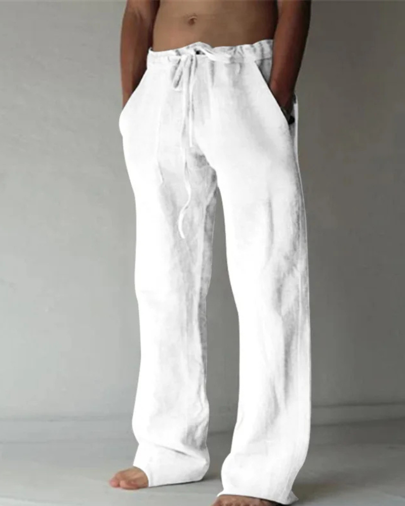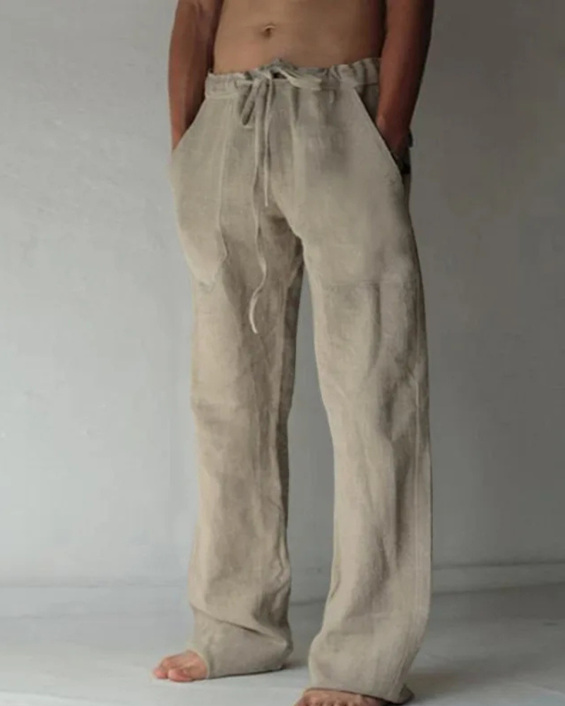 Diese Herren-Hose mit Kordelzug vereint Komfort und Stil. Der elastische Bund mit verstellbarem Kordelzug sorgt für eine perfekte Passform. Das leichte, atmungsaktive Material bietet hohen Tragekomfort – ideal für Strandtage, Yoga, Zuhause oder entspannte Freizeitlooks. Mit geradem Beinverlauf und praktischen Seitentaschen für Funktionalität.