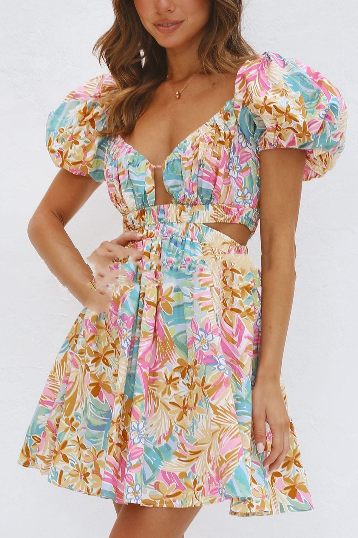 Mit diesem kurzen Kleid mit lebhaftem Blumenprint, das bei jedem Schritt auf natürliche Weise zur Geltung kommt, können Sie den Sommer in vollen Zügen genießen. Ein geraffter Ausschnitt mit Mittelschlitz betont die Brust, während Puffärmel für Volumen und romantisches Flair sorgen.