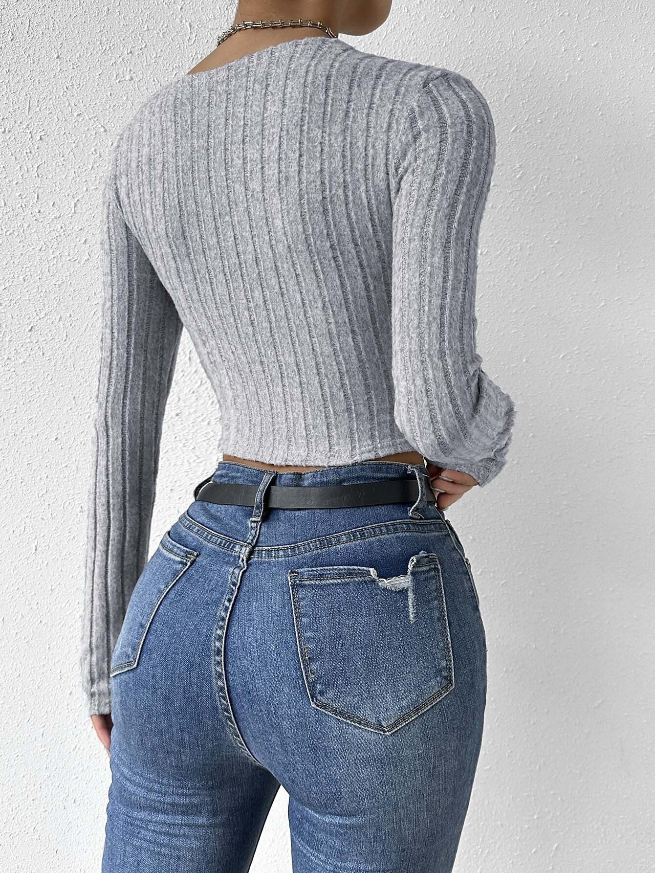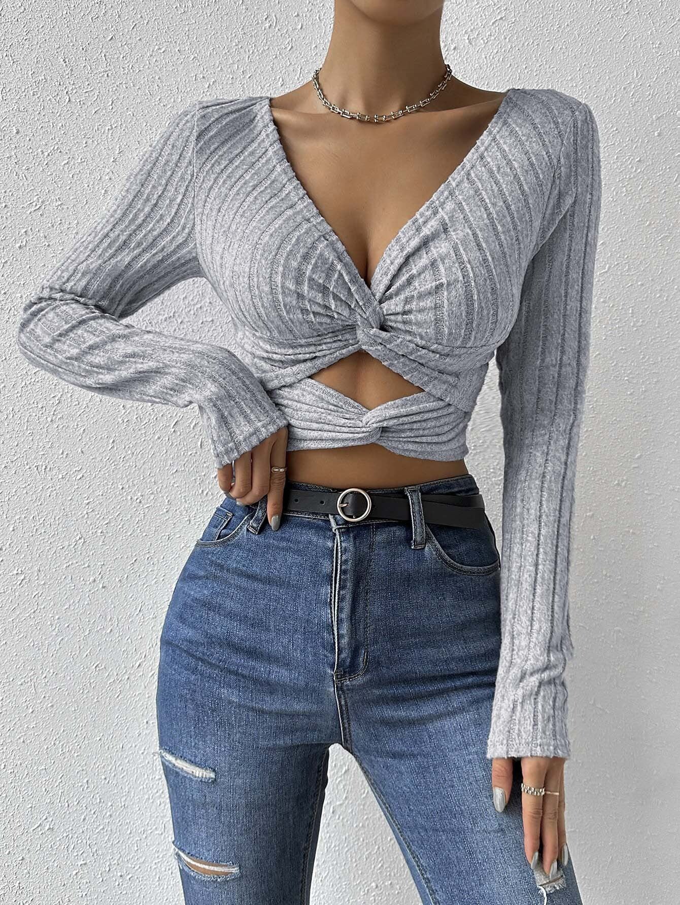 Langärmeliges geripptes Crossover-Top mit tiefem Ausschnitt für Damen - Renata