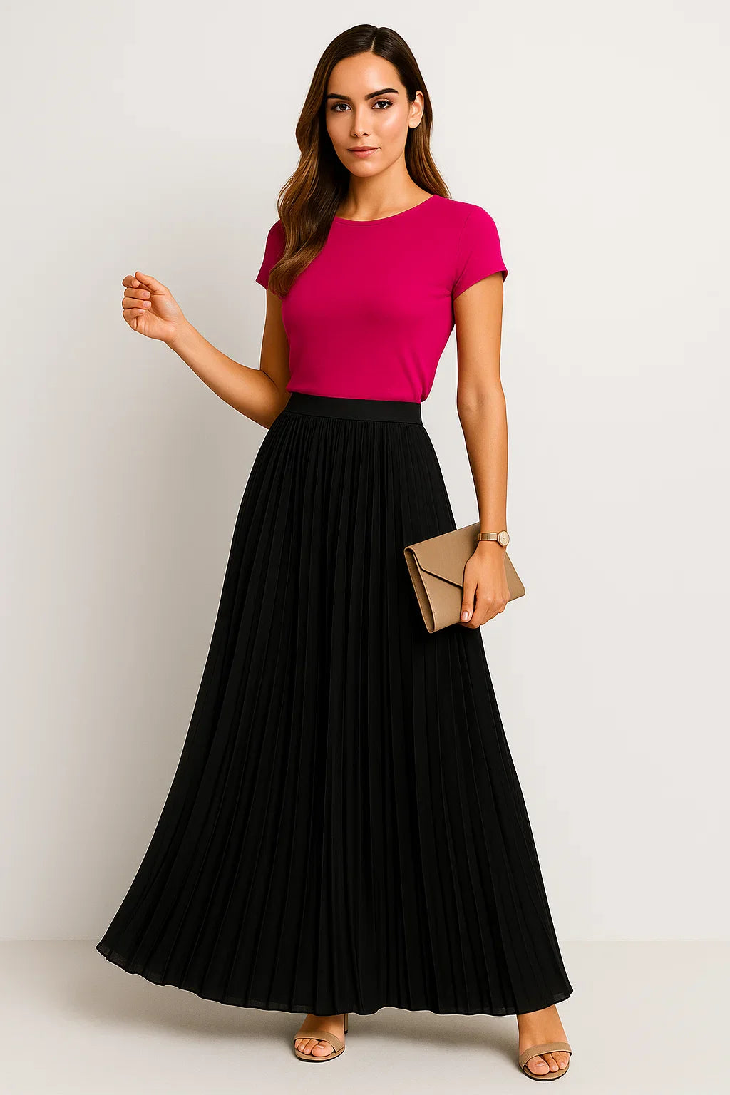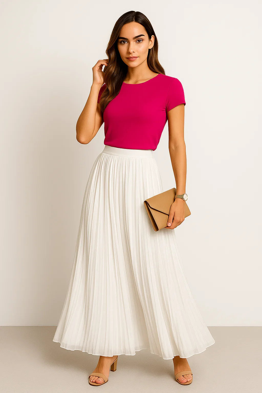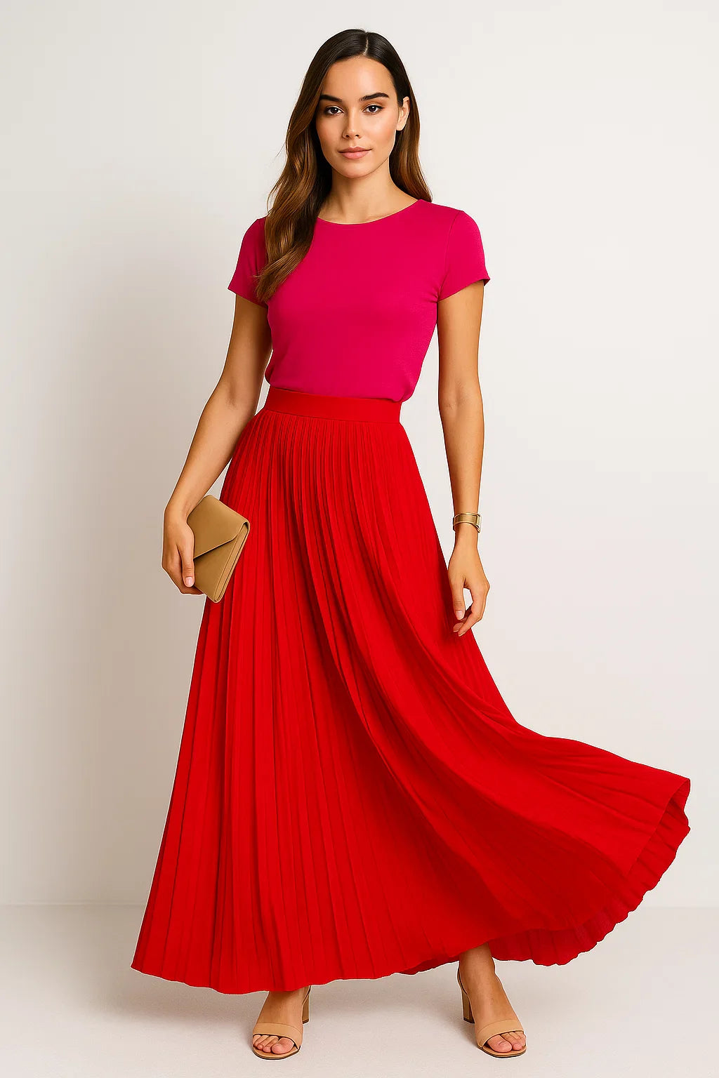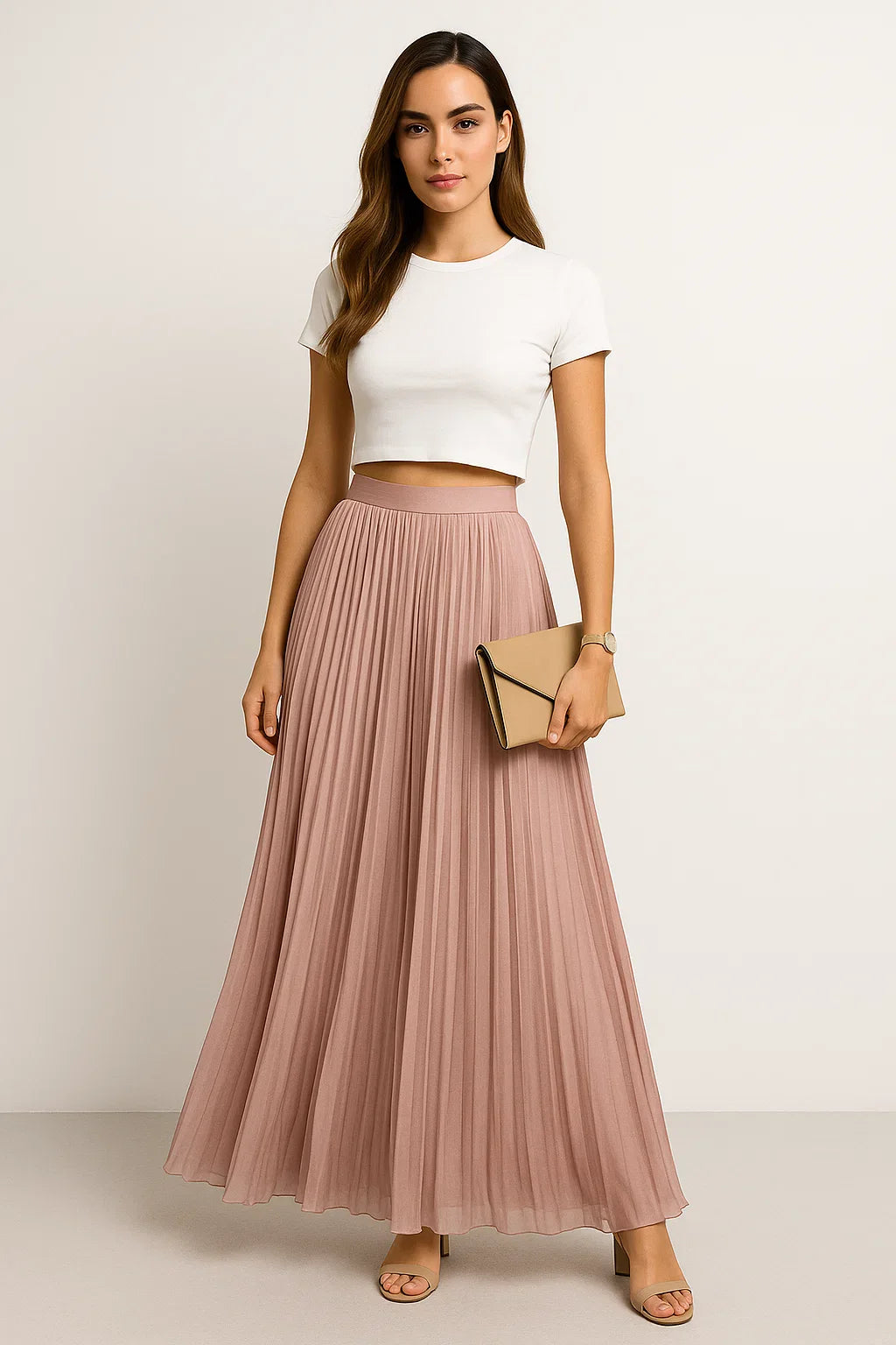 Dieser lange Faltenrock ist der Inbegriff von stilvoller Leichtigkeit für Frühling und Sommer. Mit seinem fließenden Schnitt und der angenehm luftigen Struktur ist er perfekt geeignet für warme Tage, an denen Komfort und Stil gleichermaßen zählen. Die schmeichelnde Länge verleiht jedem Schritt elegante Bewegung, während das vielseitige Design unzählige Stylingmöglichkeiten eröffnet. Ob in der Stadt, am Strand oder beim entspannten Cafébesuch, dieser Rock passt sich mühelos deinem Alltag an.