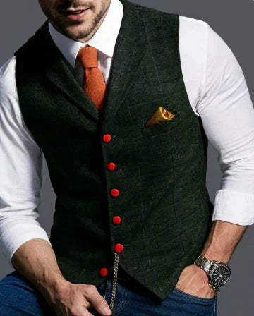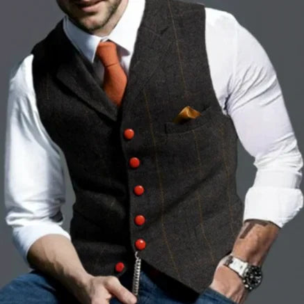 Die Vintage Weste Für Herren | Reverskragen ist ein vielseitiges Kleidungsstück, das sich gut für verschiedene Outfits eignet. Mit ihrem Reverskragen und dem klaren Schnitt ergänzt sie legere sowie formelle Kombinationen. Die Weste kann über Hemden oder T-Shirts getragen werden und eignet sich für Alltagssituationen sowie für besondere Anlässe.
